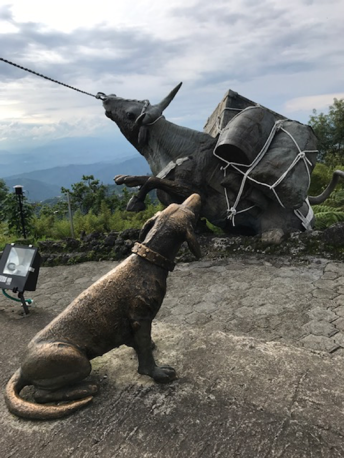 Next we taxied to the CHIPRE area, the highest in the town. Again, the views are stunning, with distant mountain ranges, and views of the city. From up here, the city is gorgeous because it is so green. Buildings are in clumps, on ridges or in valleys with lots of green in between. And the other feature up here is an extraordinary bronze sculpture with many parts, called “Agony and Ecstasy” depicting the settling of Manizales in 1834, with pioneers pushing inland to avoid strife on the coasts and in the cities. There were oxen dragging heavy burdens, stuck in mud and families climbing hills and finally arriving, quite a brilliant piece of artwork.