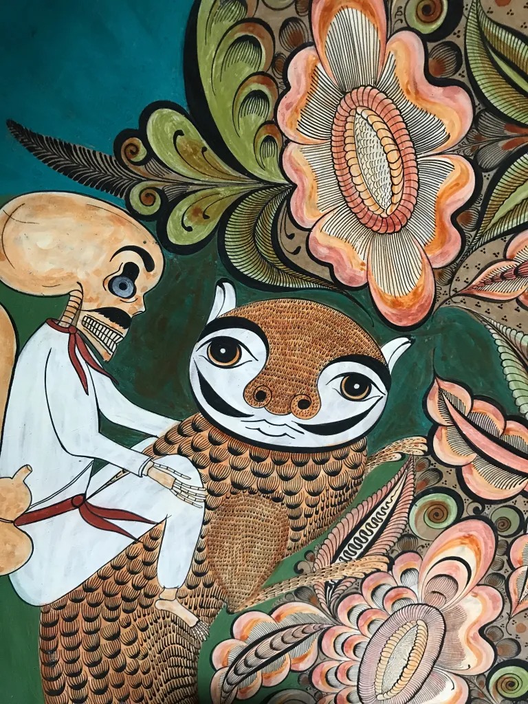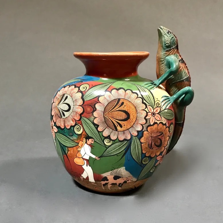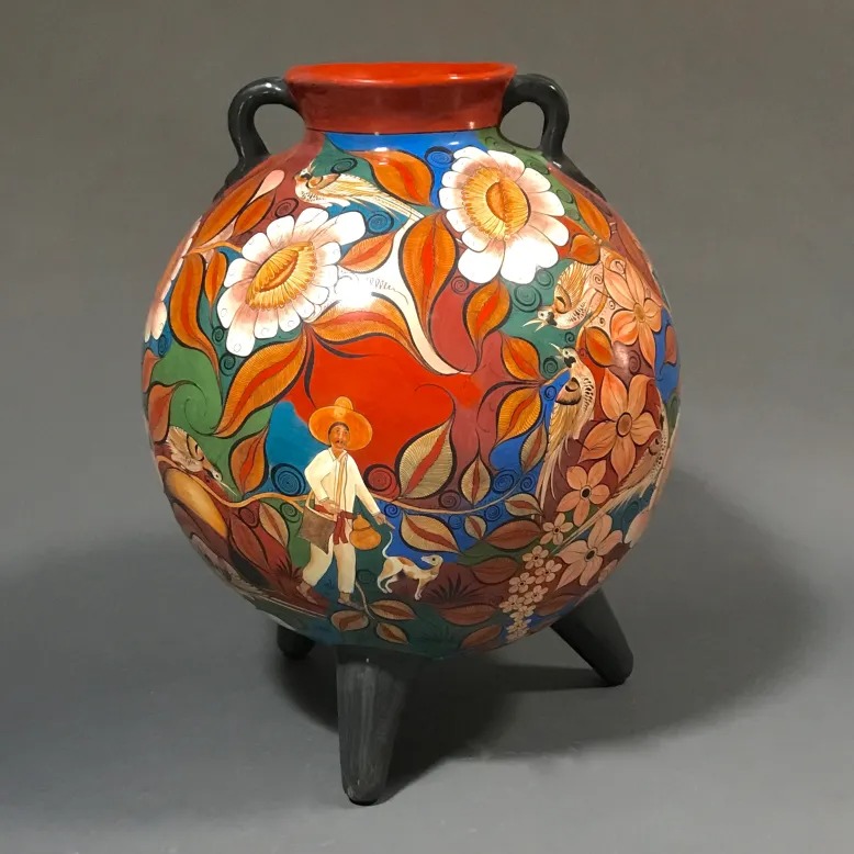 The distinctive and extraordinary feature of their work is the gorgeous and highly skilled slip decorations on the pieces. Their brushwork is as refined as the finest Japanese brushwork. They paint with slip (liquid clay) complex designs including such themes as country life; mythology; flora and fauna, old Tonalá stories; and national pride.