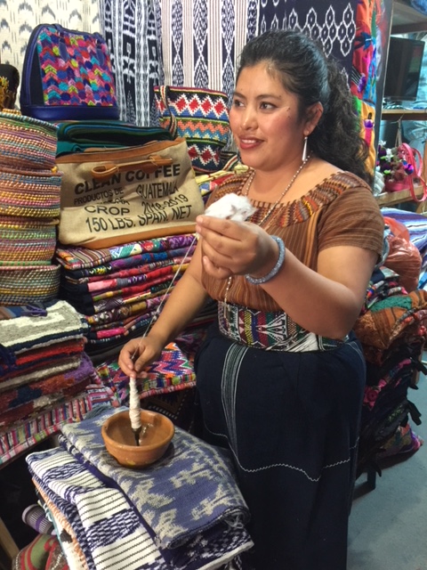 We stopped for ice tea and a delicious piece of apple pie at DOS MUNDOS, and then headed for our next destination: the shop of Juana and Luis. We first met Juana in the little village of San Juan de la Laguna on the other side of the lake several years ago, where she introduced us to the collective of thirty-five women who make gorgeous weavings. Now, she runs their store on the main drag in Panajachel. We spent a couple hours or more in there, selecting scarves, garments, table runners, etc. for the gallery. Erica excitedly picked out items for herself and for gifts.
